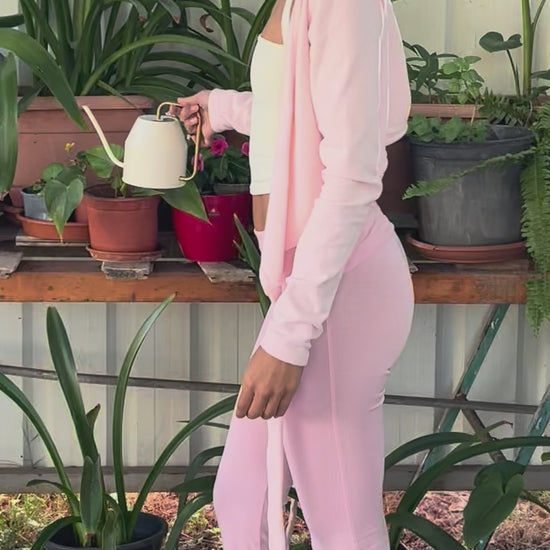 Chaquetilla de ballet cruzada que combina elegancia y comodidad a la perfección para cualquier ocasión. Está confeccionada en un tejido suave de algodón y franela con m angas ajustadas y tirantes. Puedes atar las cintas a tu gusto para que la chaquetilla te quede como desees. Ideal para deportes suaves como yoga y pilates, pero también se integra fácilmente en tu vestuario diario. Apta para bajas temperaturas. Combínala con nuestros Flare Pants - Cotton Candy.